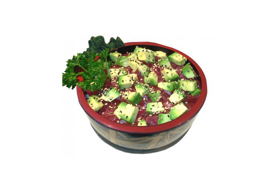 thon rouge coupe en tartare sur un bol de riz vinaigre