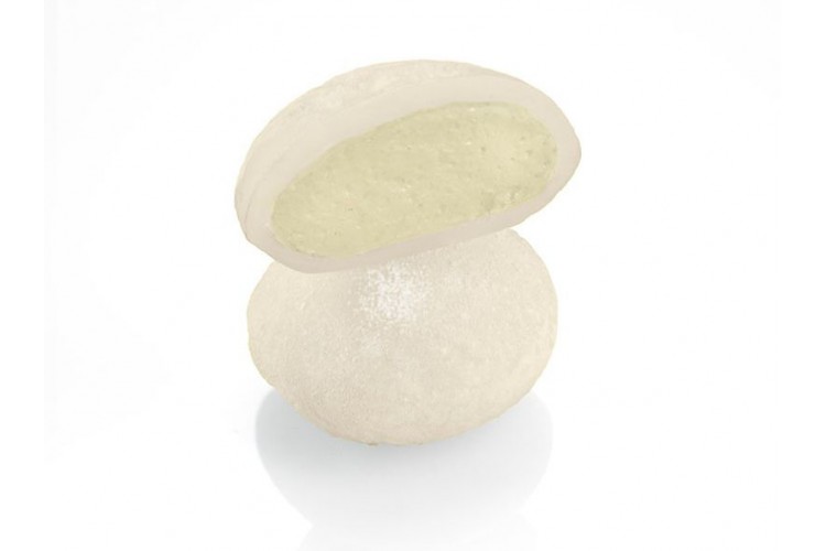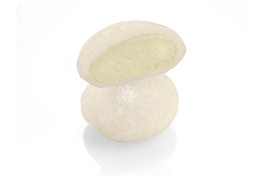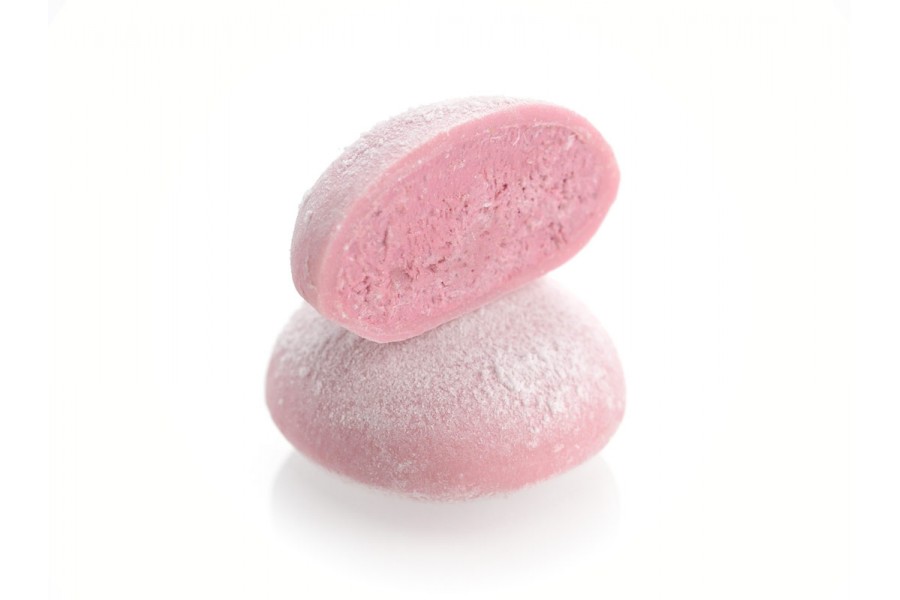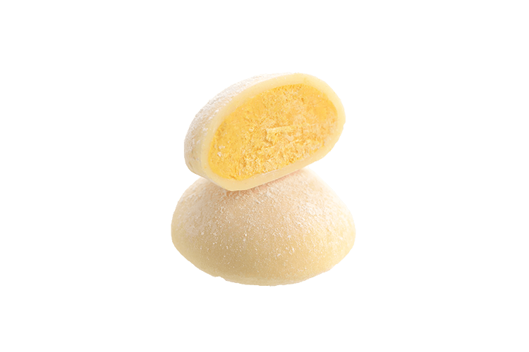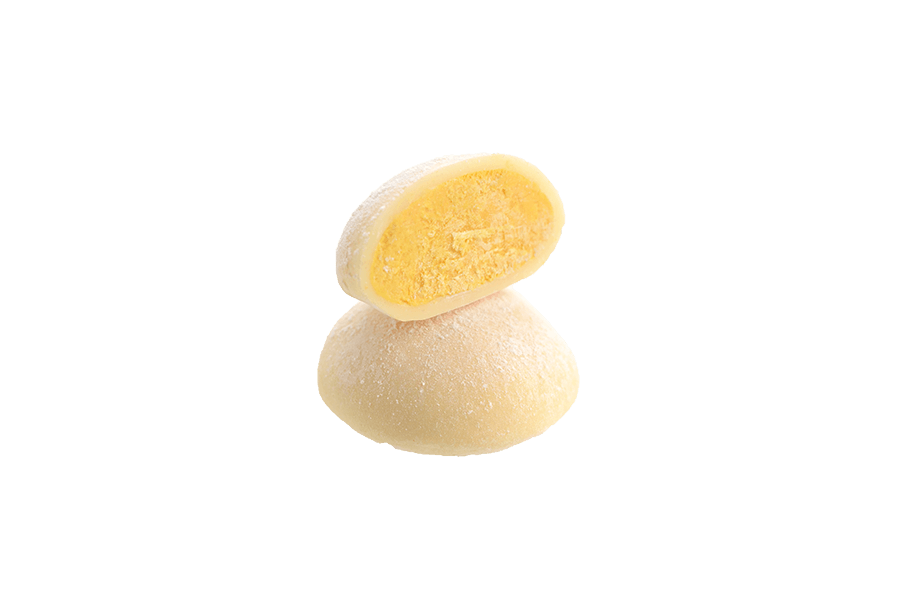 Pâte de riz gluant en couche supérieure et crème glacée au cœur du produit.