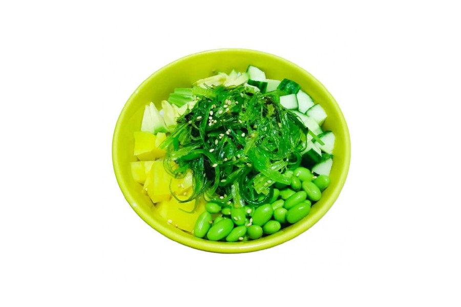 Avocat, concombre, radis jaune, salade d'algues, oignons frits et sésames.